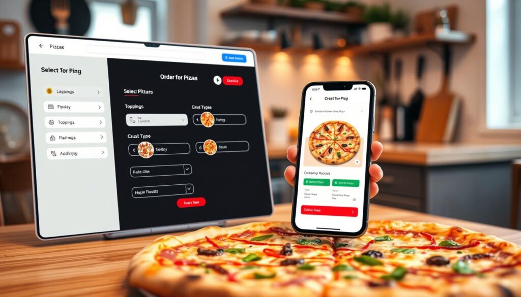 An online pizza ordering process, with a well-designed website interface in the foreground, showcasing the step-by-step flow of selecting toppings, crust type, and delivery options. In the middle ground, a smartphone displays the mobile app experience, highlighting the convenience of ordering on-the-go. The background features a cozy kitchen setting, with a wooden table, utensils, and a freshly baked pizza, creating a mouthwatering atmosphere. The lighting is warm and inviting, with a soft focus on the details, emphasizing the delightful experience of ordering and enjoying a delicious pizza.