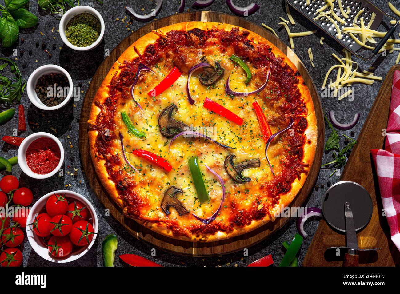 - Создайте композицию с ингредиентами вокруг пиццы